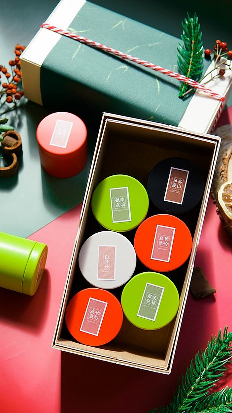 中國茶禮盒六罐不同款的中國茶:春摘茉莉銀毫|高山茉莉香鳳凰單樅|桃灼烏龍|白牡丹,木皮盒包裝,綴以日本和紙。